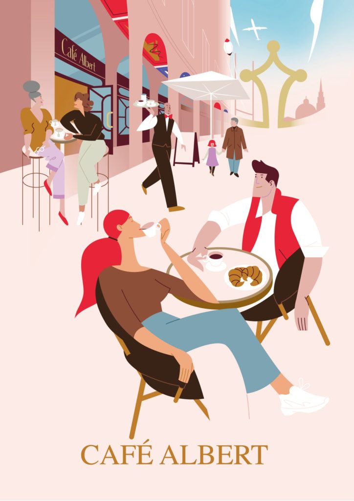 Notre mission a démarré avec la création d’une illustration de couverture originale, pensée comme une scène de vie emblématique du Café Albert. On y retrouve la terrasse animée, un serveur en mouvement, les habitués en discussion et bien sûr, l’indétrônable café-croissant du matin.