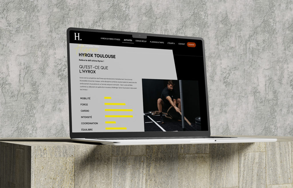Déjà dotée d’une identité graphique forte, cohérente et reconnaissable, H. souhaitait aller plus loin en créant un site internet vitrine à la hauteur de son positionnement : moderne, dynamique et résolument tourné vers la performance sportive. L’objectif du projet était double. D’une part, présenter clairement l’ensemble de l’offre du club — Hyrox, H. Fit, Yoga, préparation physique et entraînements spécialisés — et, d’autre part, transmettre l’expérience unique vécue par les adhérents au sein du club, idéalement situé au cœur de Toulouse.
